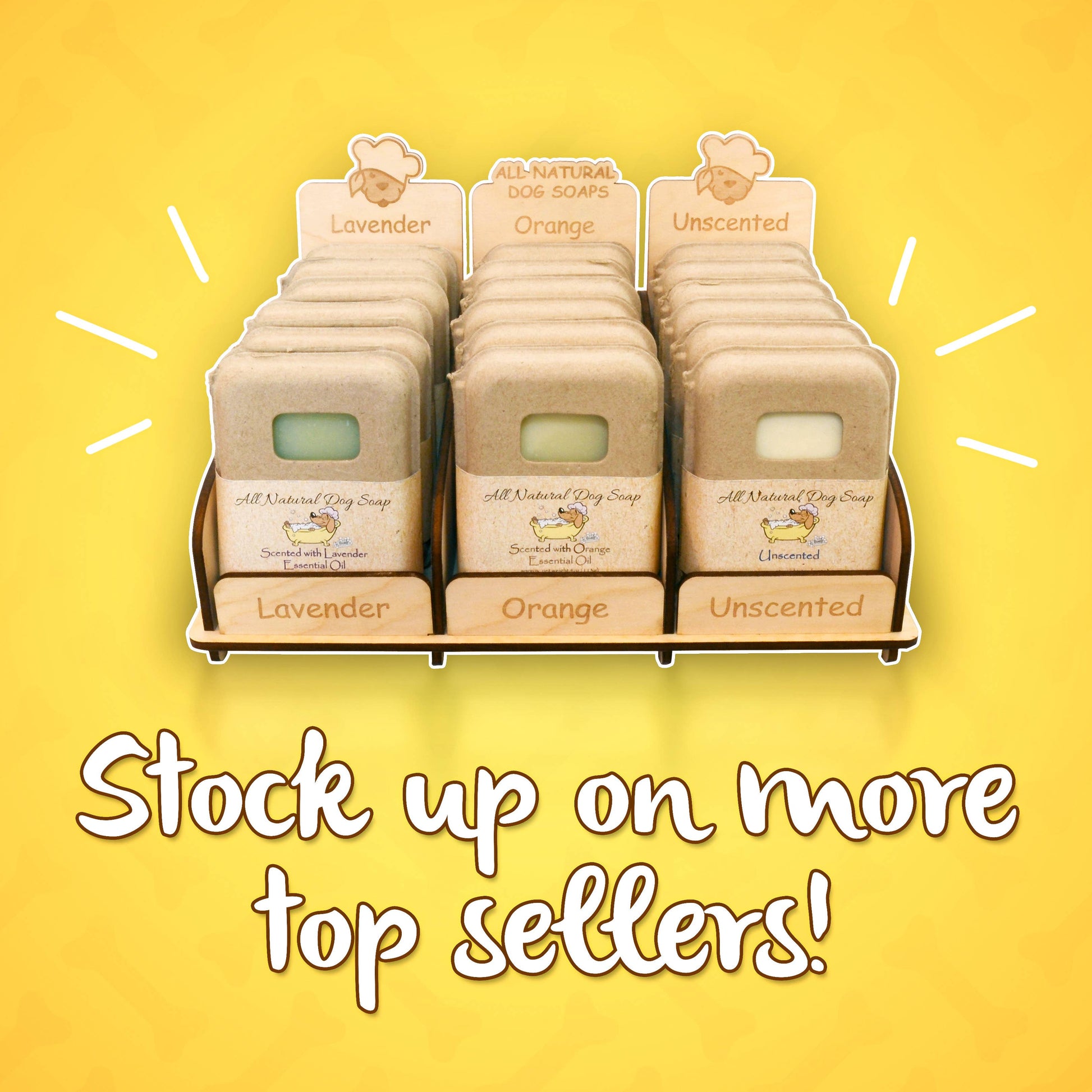 There are three options for the dog soap bar - orange, lavender, or an unscented dog shampoo bar. Alongside these pet grooming products, the brand also produces all natural dog treats and paw wax, all of which are shipped from the USA, arriving quickly in your store before flying off the shelves.