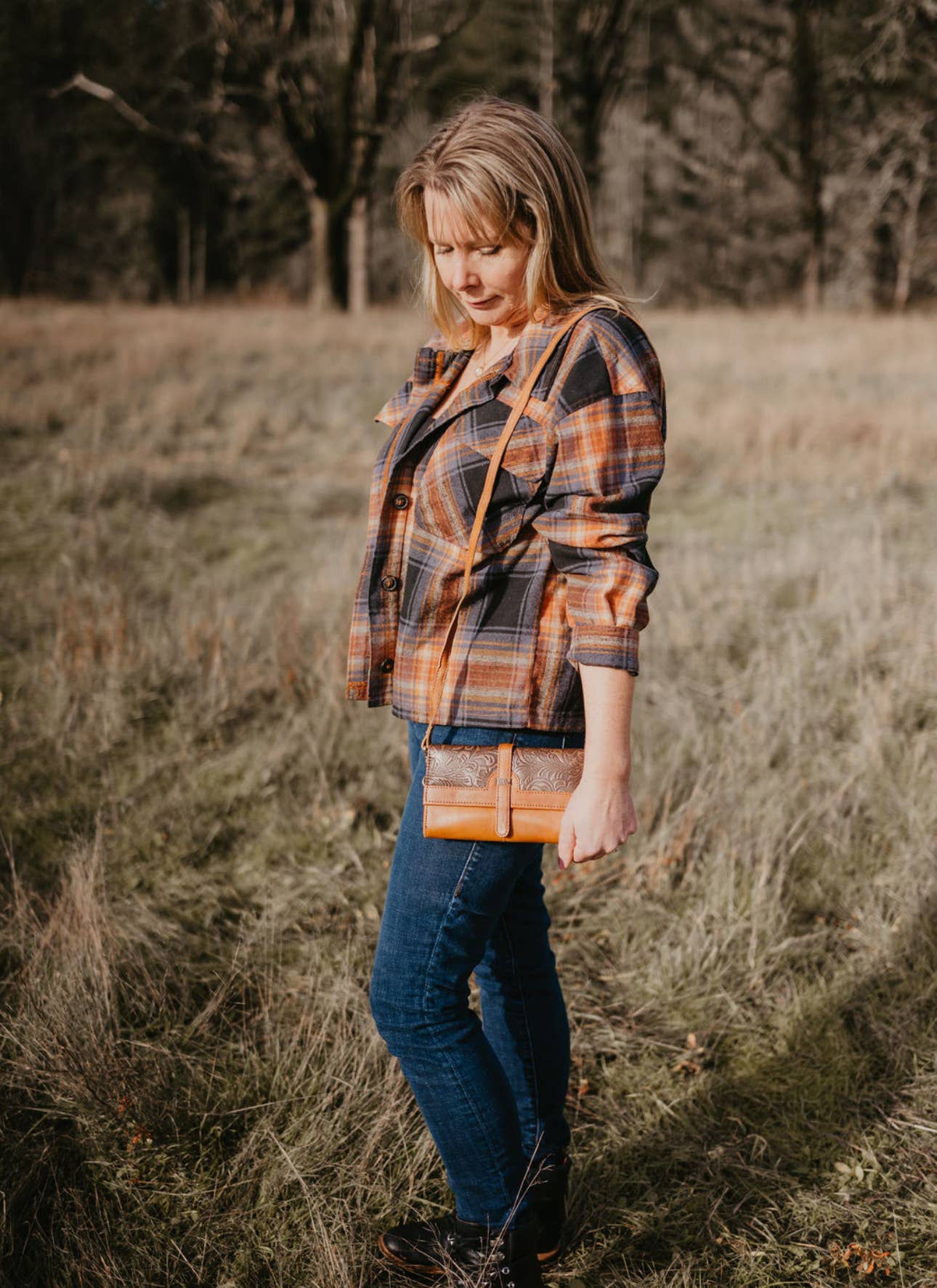 A trifold leather wallet with tooling design, comes with a removable strap for crossbody wear – combining style and practicality effortlessly.