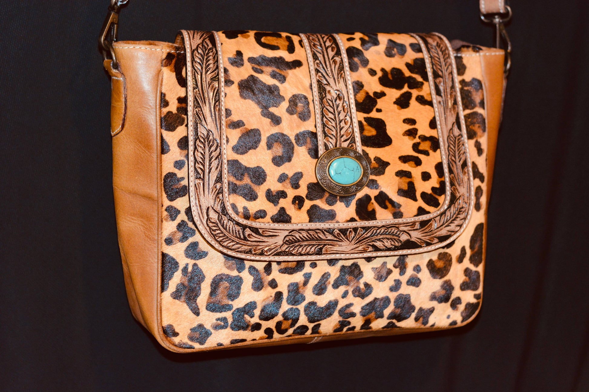 This stunning shoulder bag pairs bold Western style with modern flair. The front flap showcases vibrant leopard-print cowhide bordered by deeply hand-tooled leather in a feather motif, accented with a striking turquoise concho at the center. The rich, smooth tan leather body features a zippered back pocket and reinforced sides for durability. Inside, a secure magnetic closure and roomy lined compartment make this bag both functional and eye-catching.