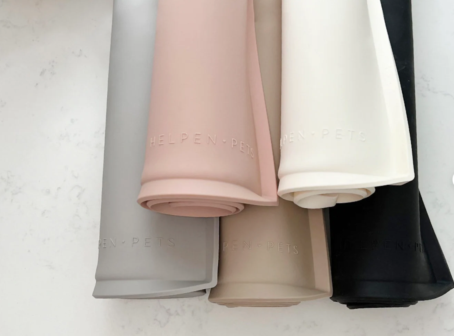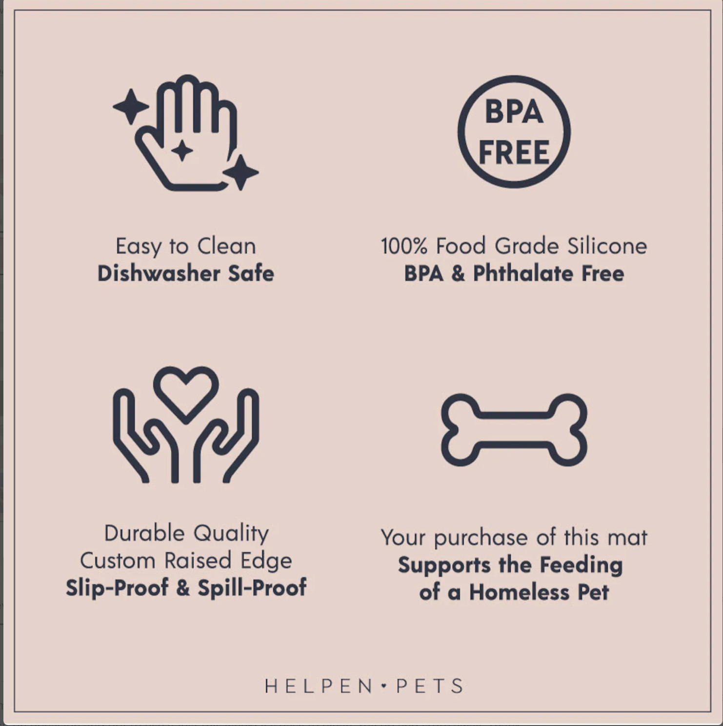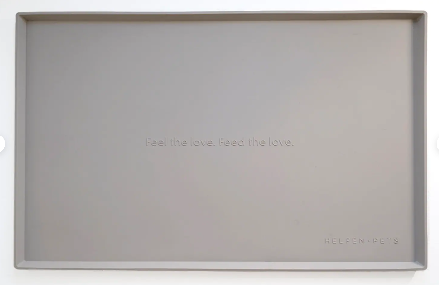 This stylish pet food mat is slip-proof, spill-proof, and dishwasher safe! Designed in California, it is made with non-toxic 100% food grade BPA & phthalate free silicone that is safe for humans and pets. This silicone mat comes in six colors that pair perfectly with your Helpen Pets feeder and your home decor...and it's ready for Instagram! "Feel the Love, Feed the Love" embossed at the center of the mat as a portion of each purchase goes towards feeding a homeless pet for 2 weeks. Together we can all help get animals off the streets, into warm arms and their own collar.