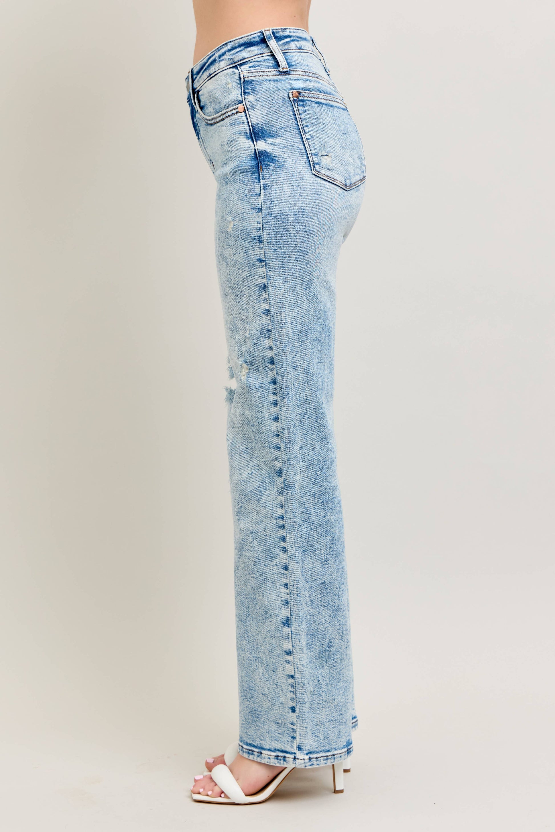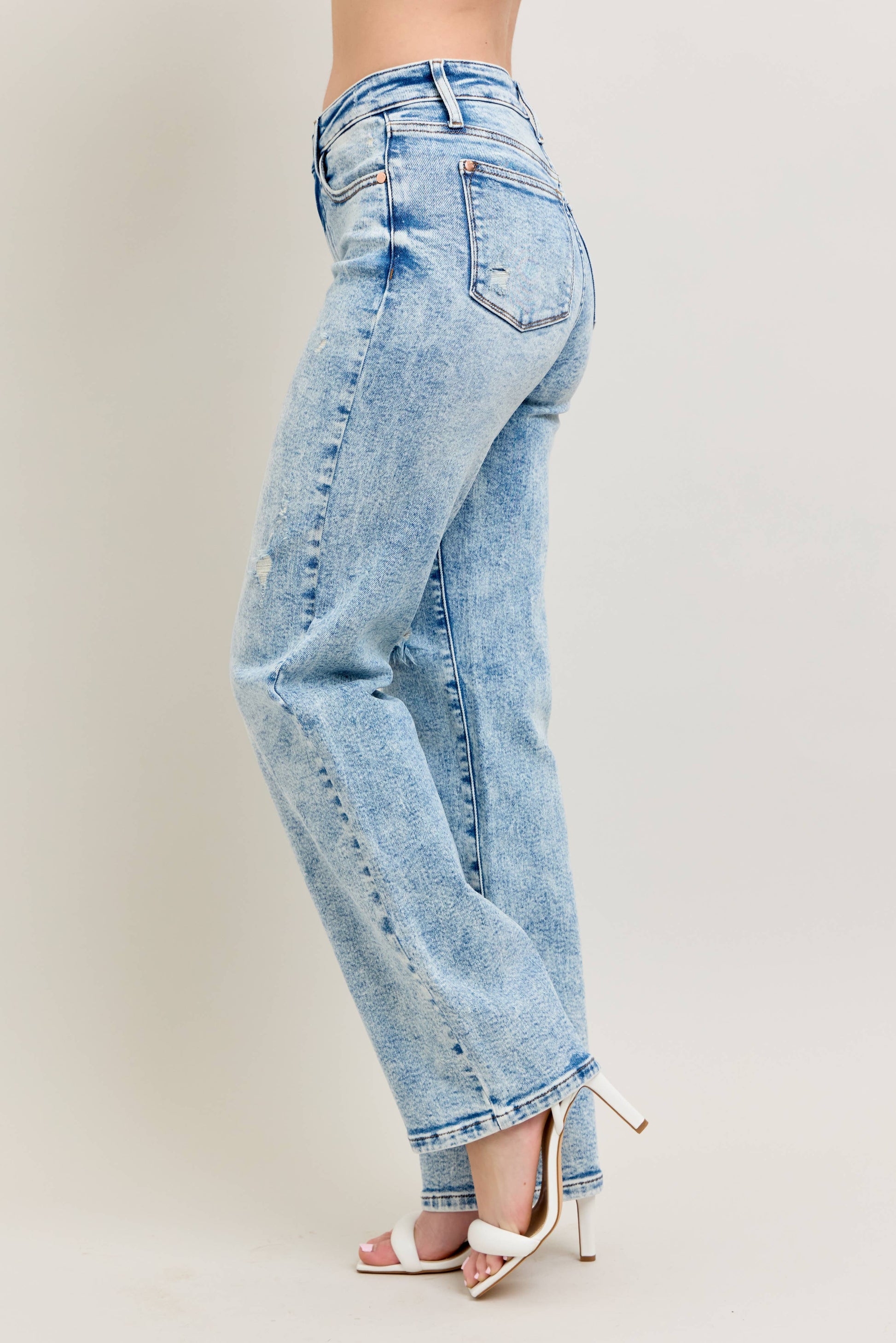 Our Mineral Wash High Waisted Distressed 90's Straight Jeans are a must-have for any contemporary wardrobe. These jeans are perfect for the spring/summer season, featuring a high waist that complements the floor-length, straight cut. The light wash gives these jeans a 90's vibe, while the distressed detailing adds a modern edge. Crafted with a blend of 94% cotton, 5% polyester, and 1% spandex, these jeans offer both comfort and durability.
