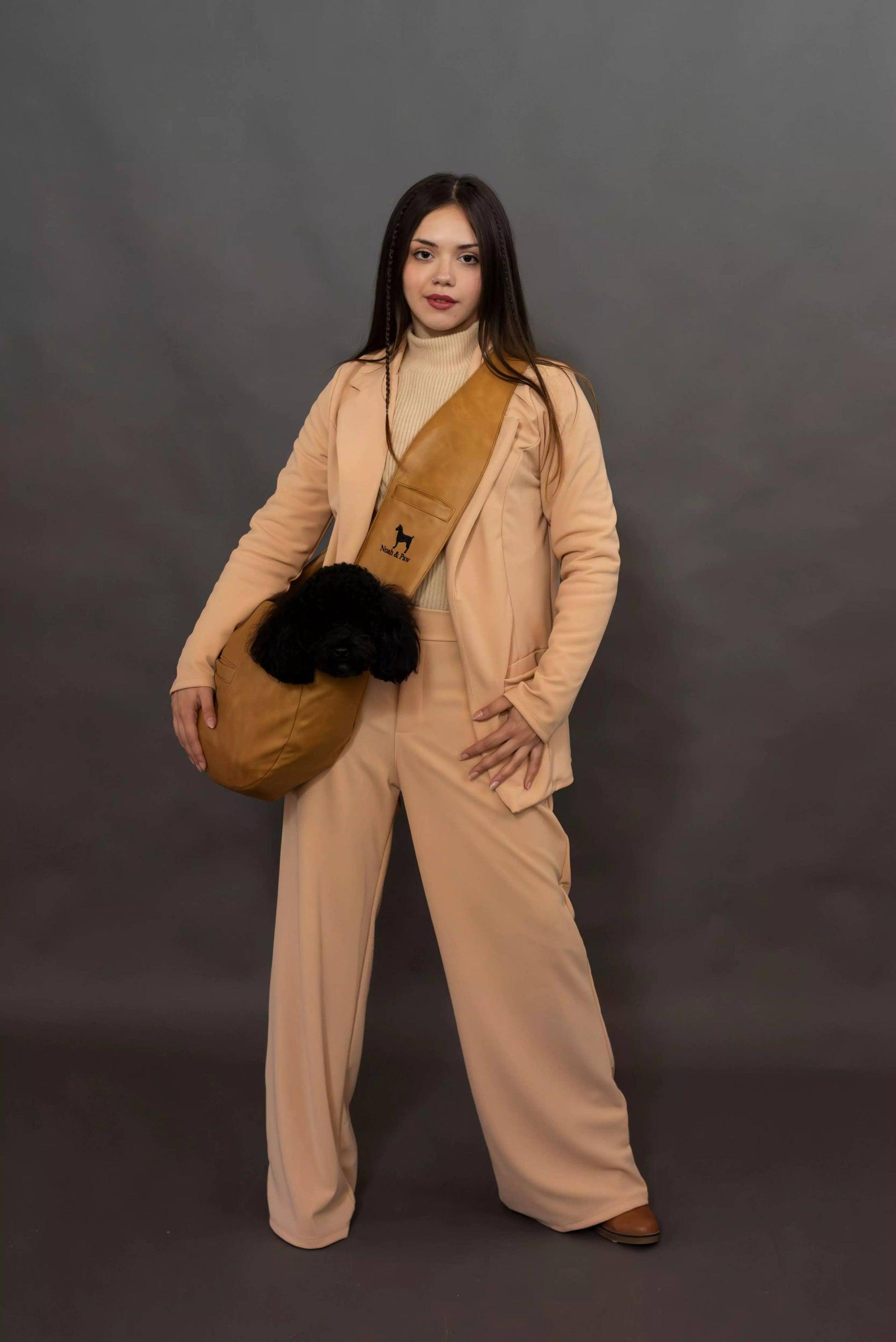 Luxury dog sling carrier, fashioned from top-tier vegan leather. Designed with your convenience in mind, made with washable materials. This dog sling carrier combines style and practicality, to meet all your expectations.