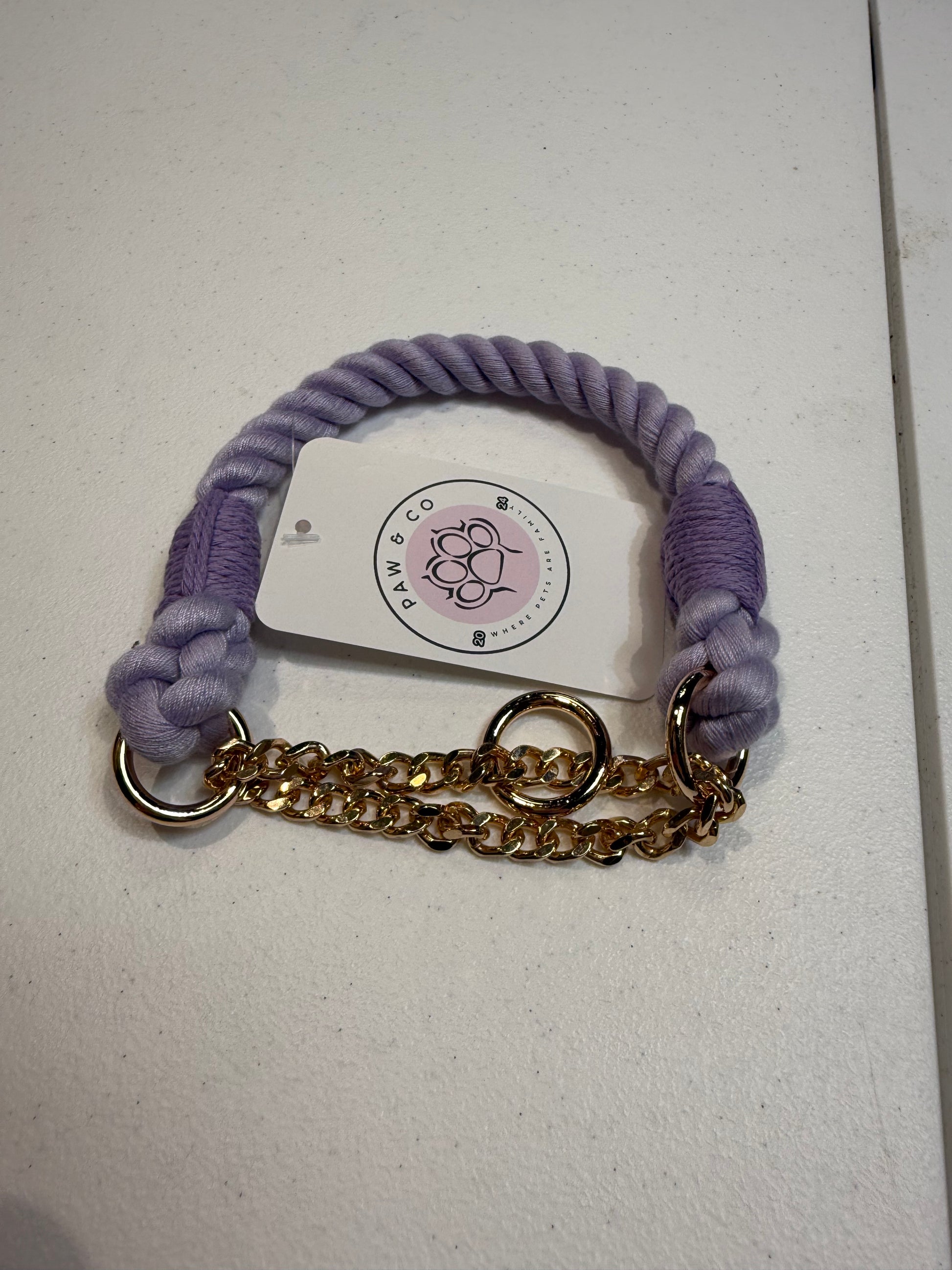 Our Rope Martingale Dog Collar offers a stylish twist on a classic design, combining the strength of a chain with the comfort and charm of a hand-dyed rope. The durable rope features a smooth blend of soft, pastel colors, giving each collar a unique, eye-catching look. Paired with sturdy metal chain links and secure hardware, this collar provides reliable control while remaining gentle on your dog’s neck. Perfect for everyday wear or training, it delivers a balance of durability, comfort, and vibrant style.
