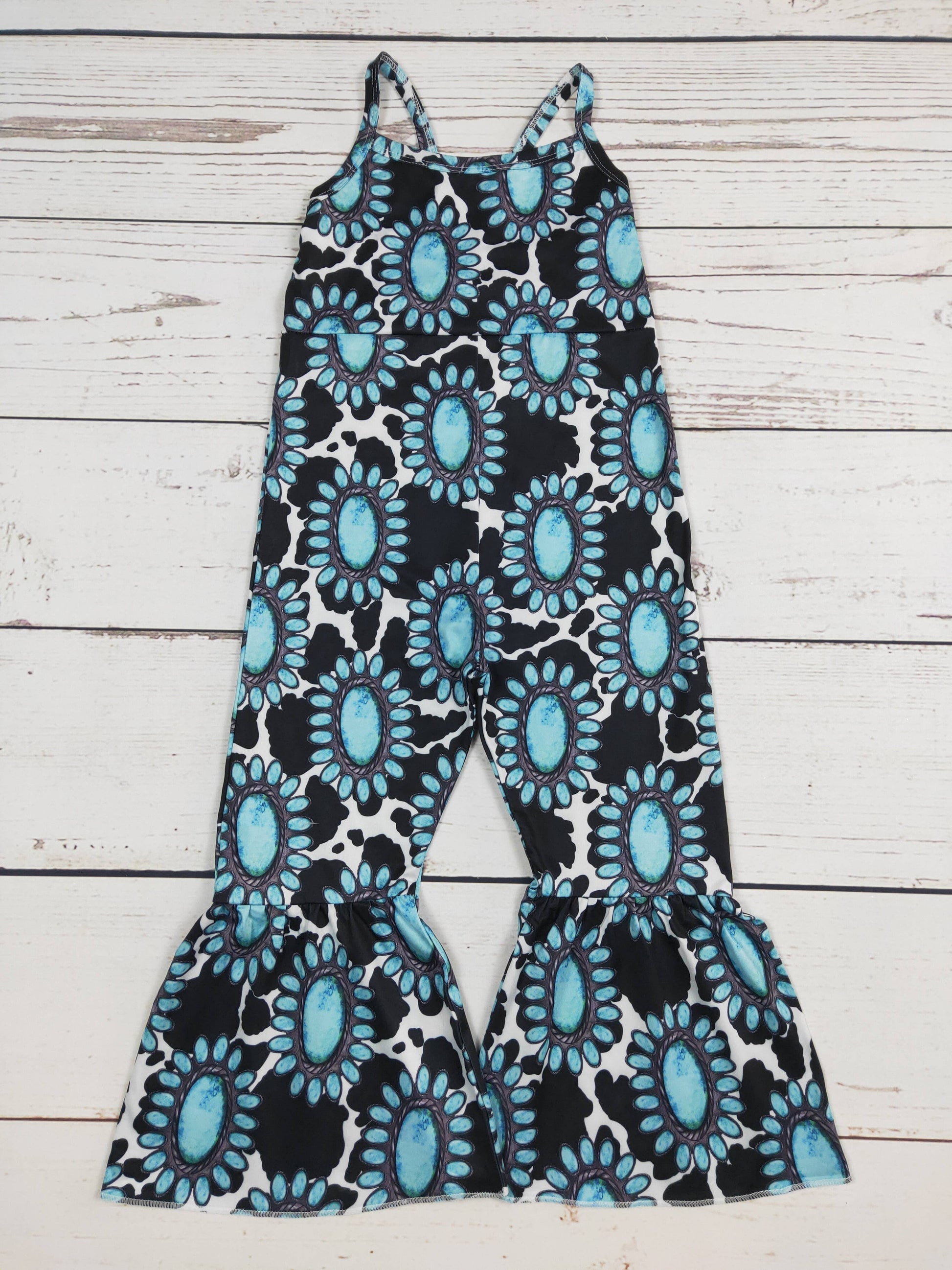 Turquoise Cow Printed Baby Girls Jumpsuit Designed for comfort and style, this jumpsuit is made with high-quality materials and printed with a vibrant turquoise cow design. With a smooth and breathable fabric, your baby girl will stay cozy and cool all day long. Upgrade your baby's wardrobe with this must-have jumpsuit today. Material is polyester
