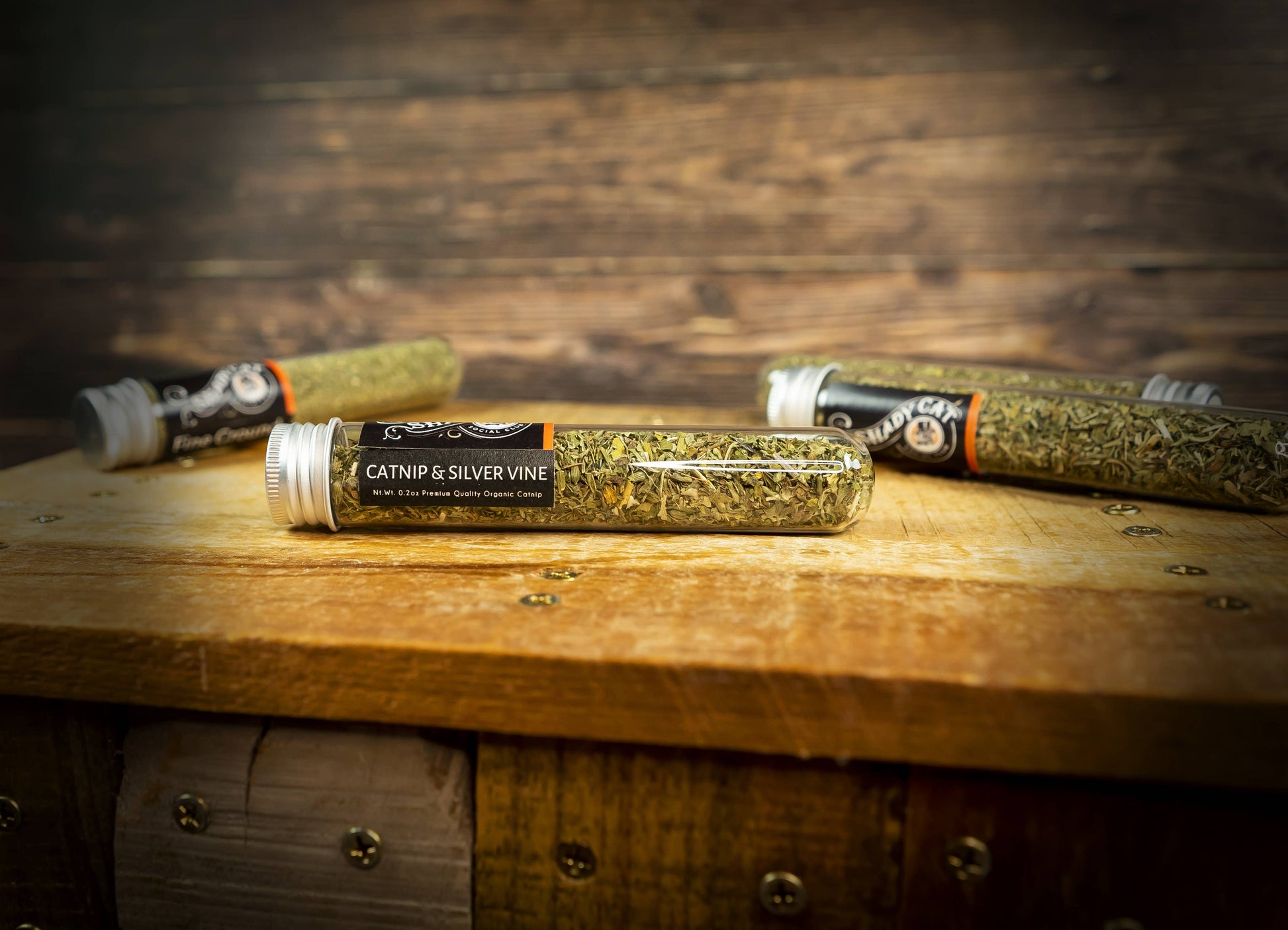 Catnip & Silver vine - an amazing and power packed blend of our original Leaf & Flower catnip with organic ground Silver vine. A double whammy! If the catnip does not immediately tickle your cats fancy, the Silver vine will definitely do the trick. All four of Shady Cat's catnip blends are offered in a 1.25 oz. bag and .20 oz. glass tubes! Take your pick! You can't go wrong! How to use our catnip: we recommend that you keep your catnip stored in it's airtight bag. All your cat needs is a pinch. For maximum potency, rub the catnip between your fingers to release all the oils stored in the catnip. This blend is also great for multi cat households as not every cat is born with the gland that makes them respond to catnip! They should still respond to the silver vine in the blend though. I always let customers know that there is 5x the catnip in the black bag for just twice the price, so if they know their cat(s) love the product, go for the bag! Tubes are great for trying us out!