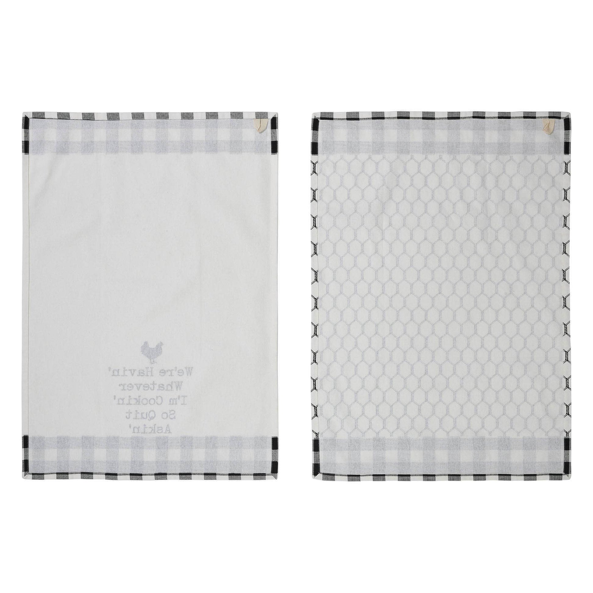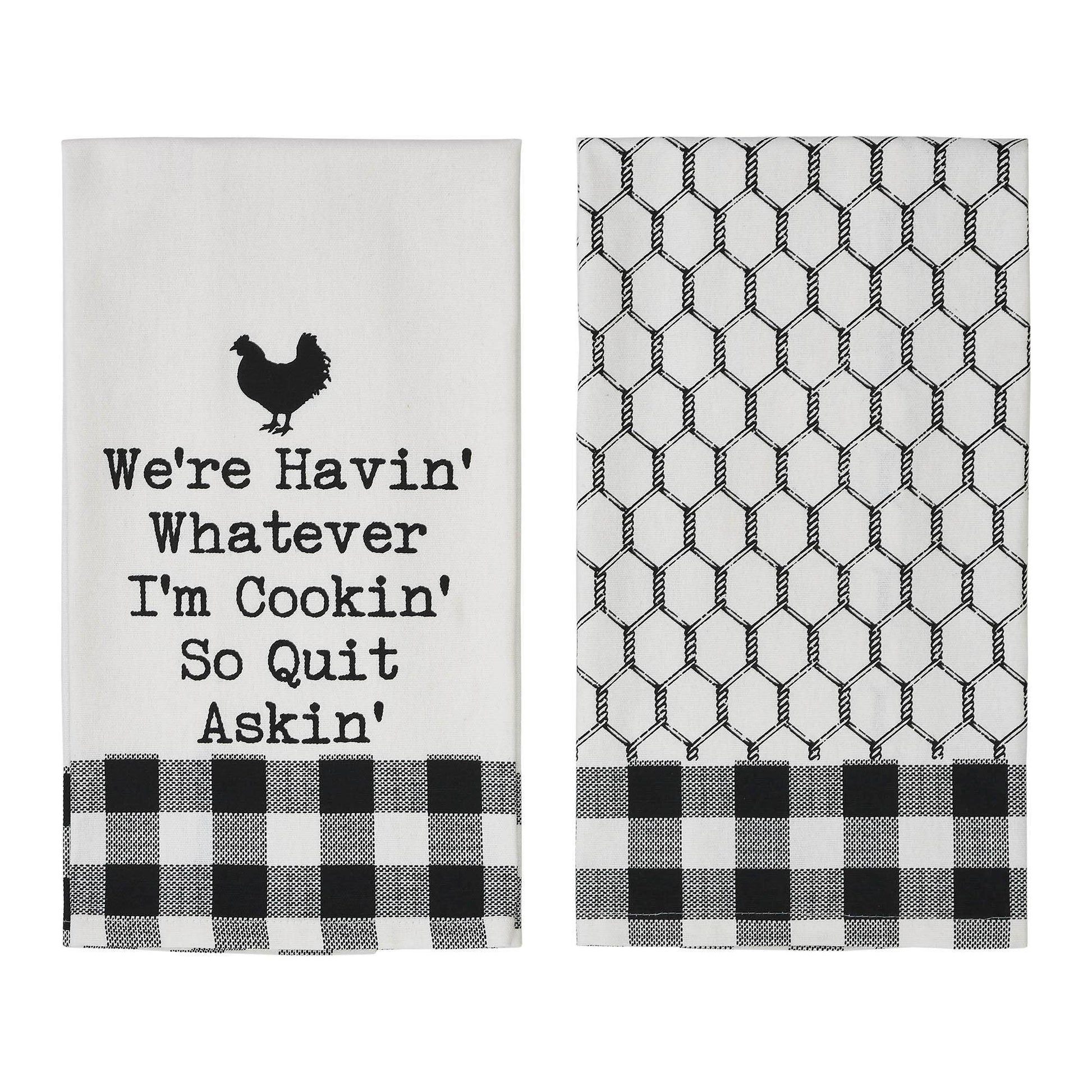 Elevate your farmhouse kitchen decor with the VHC Brands Down Home Collection Cotton Kitchen Towel Set. This set of two printed tea towels adds a charming touch to your culinary space. Crafted from soft white cotton, these 28x19-inch rectangular towels are both decorative and highly functional, making them essential for your farmhouse-inspired home. Cook with attitude and farmhouse style. Whether you're drying dishes, serving freshly baked goods, or decorating your space for fall or Easter gatherings, these towels have you covered. Their farmhouse graphic print adds a modern twist to the classic farmhouse style, making them versatile for various occasions. These cotton tea towels are perfect for crafting, too, ready for your creative touch. Whether you're into hand embroidery, applique, or other crafting techniques, these towels are an ideal choice. Their quality construction ensures they stand up to everyday use, making them a charming and durable addition to your kitchen or craft room.